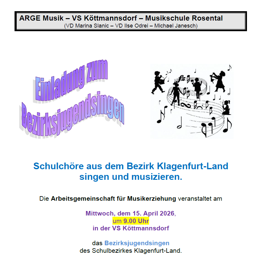 Die Arbeitsgemeinschaft für Musikerziehung veranstaltet am Mittwoch, dem 15. April 2026 um 09:00 Uhr in der Volksschule Köttmannsdorf das Bezirksjugendsingen des Schulbezirkes Klagenfurt-Land.